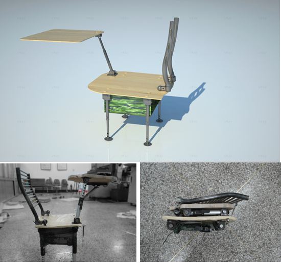 该作品主要是通过可伸缩机构实现桌椅的上升与下降,达到调整身高与座椅之间的关系,靠背采用的事球铰副机构,符合阿克布罗姆靠背曲线,靠背最后收在椅面上,桌腿上采用布做抽屉存放书籍等物品,节省了材料。同时最终将腿收起来,靠背收起来可以折叠成一个盒子方便存放,节省了教室的空间。